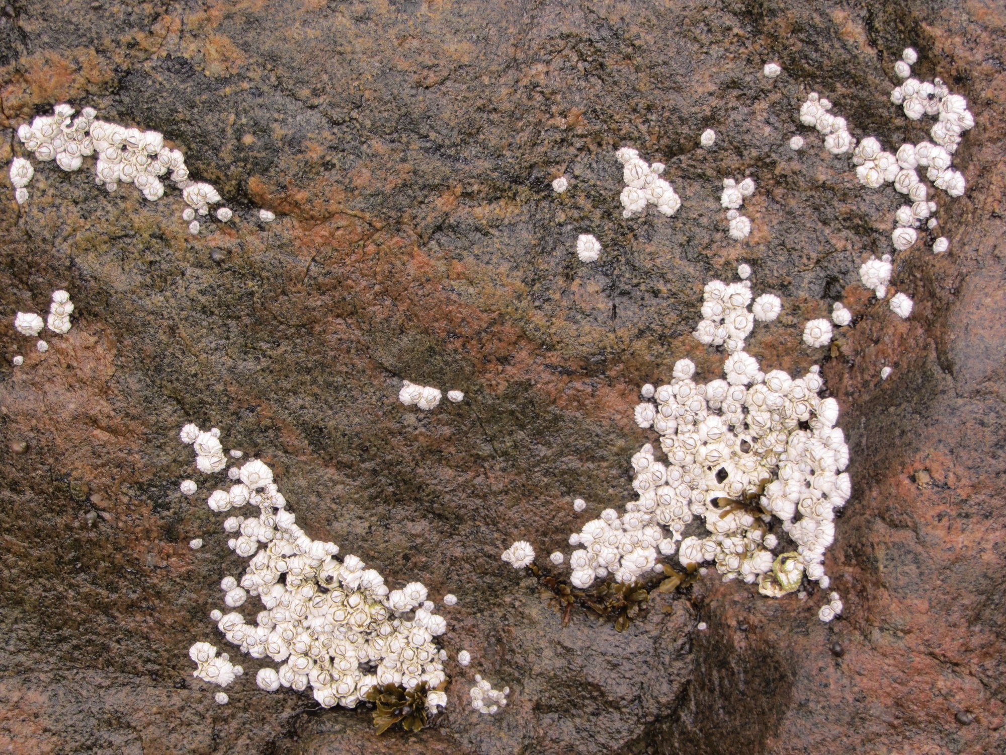 Three clusters of barnacles on a rock now at low tide, villages of little homes built close together.